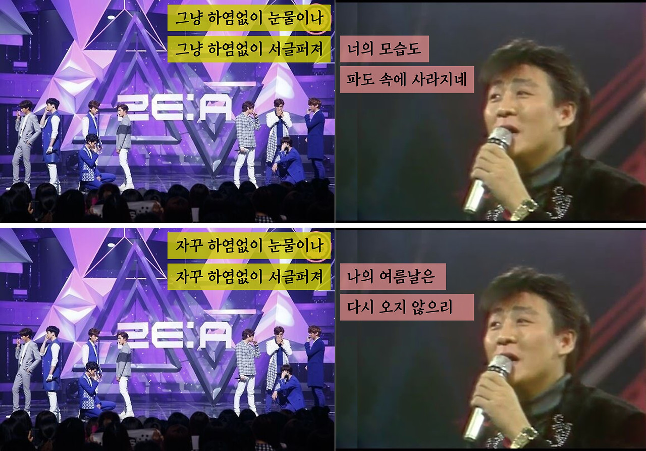 가장 많이들 아는 조합일 것입니다. 예전 예능프로그램 <뜨거운 형제들>에서 박휘순이 불러 한동안 유행했던 노래이다. 발표된 시기는 한 20년 가까이 차이가 나지만 전혀 이질감 없이 이어지는 노래입니다.