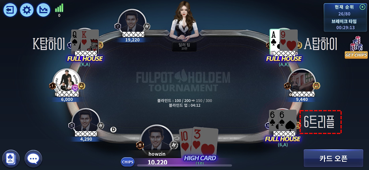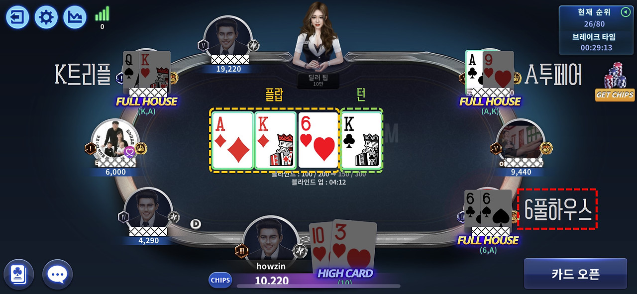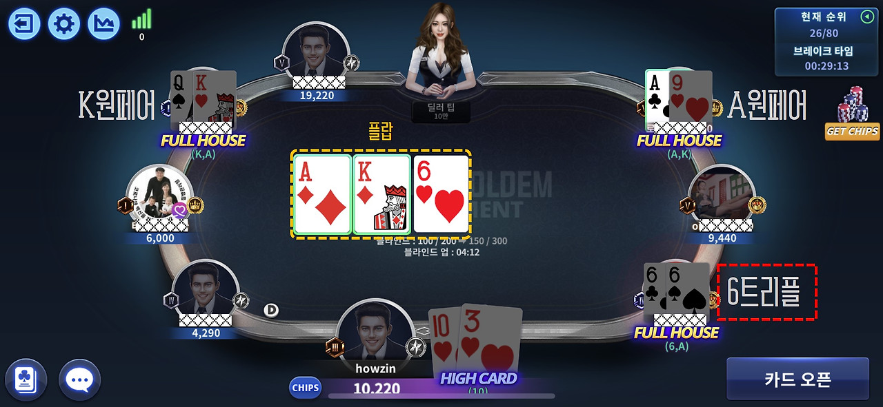 턴에 'K♣'가 떨어지면서 상황은 급변하게 되었다. K원페어는 K트리플로, A원페어는 A투페어로, 6트리플은 6풀하우스로 각각 한 단계씩 업그레이드되었다. 세 명 모두 상대방의 패를 모르는 상황에서라면 승리를 확신할 수 있는 정도로 각각 높은 카드가 맞기 때문에 승부는 좀 더 알 수 없는 국면으로 접어들게 되었다.