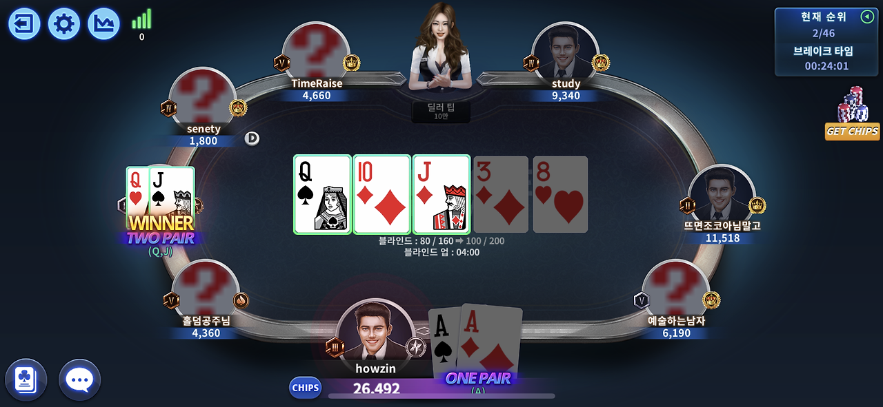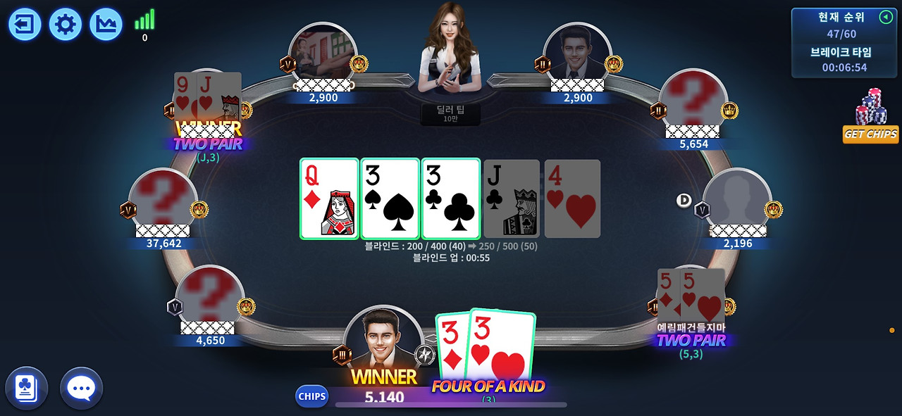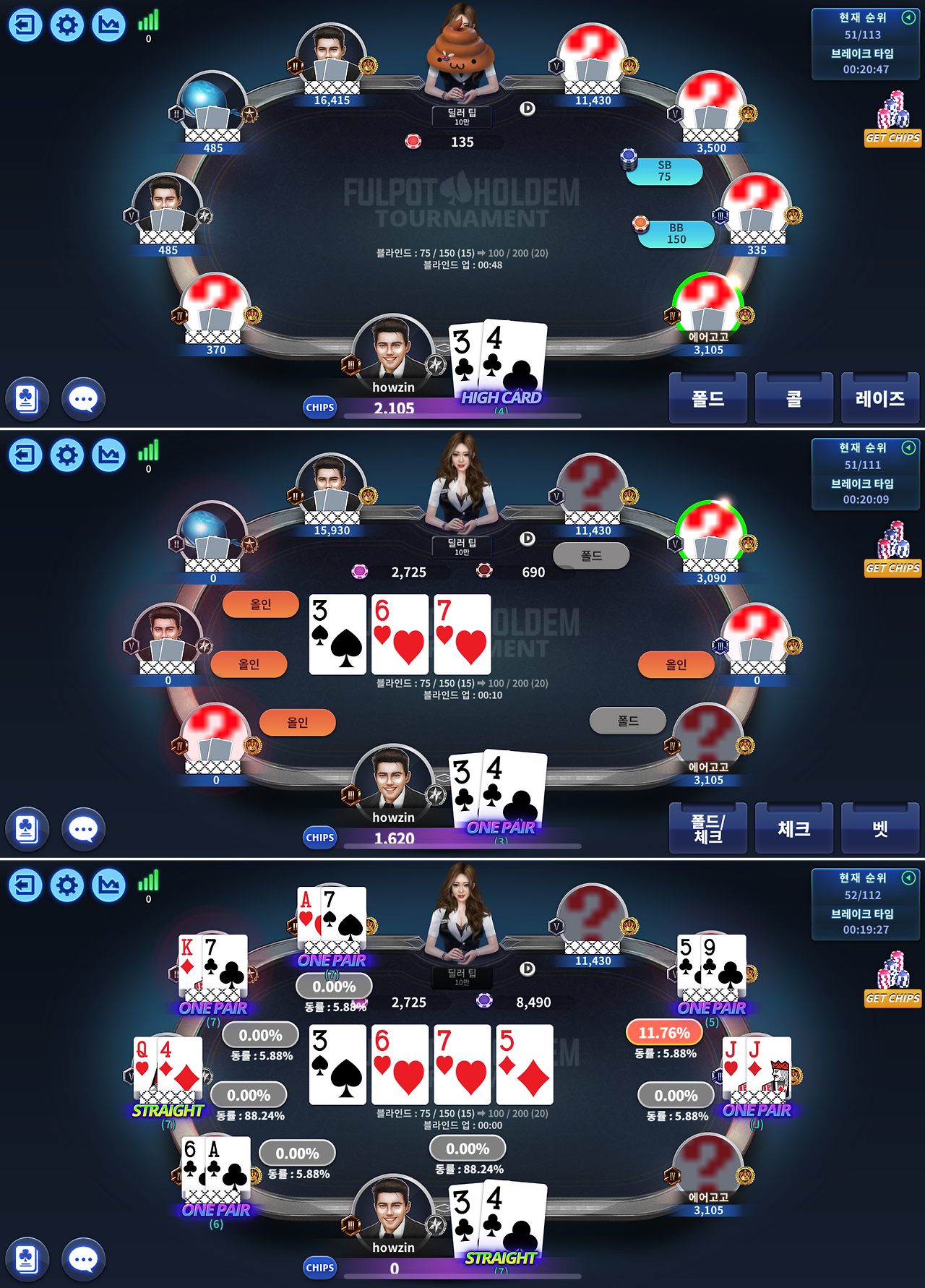 이렇게 평범하게 시작한 게임이 엄청난 반전에 반전을 거듭하는 명승부가 될 줄은 몰랐다. 물론 이 판에서 나는 초반에 일찌감치 폴드를 하고 '팝콘각'의 자세로 경기를 관람했다. 내가 홀덤을 하면서 경험한 가장 치열한 경기가 분명하다. 물론 처음부터 타인의 핸드를 볼 수 있는 게 아니기 때문에 플레이가 종료된 이후에나 이 모든 반전의 과정을 알게 된 것이다.