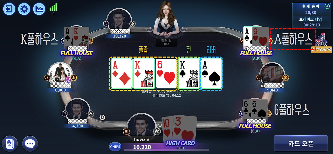 마지막 리버에 'A♠'가 떨어지면서 이 엄청난 명승부에 화룡점정을 찍었다. 세 명이 모두 풀하우스가 되었지만 누구도 서로의 패가 풀하우스인지 알 수가 없도록 숨겨져 있기 때문에 패를 오픈하기 전까지도 모두 자신이 승리할 것이라 예측했을 것이다. 최종적으로 세명 모두 풀베팅으로 올인하면서 패가 오픈되었고, 최종 A풀하우스가 승리를 거머쥐며 대미를 장식했다. 앞서도 언급했듯이 짧지 않은 시간 동안 홀덤을 하면서 이렇게 명승부를 본 기억이 없다. 특히 동시에 3명이 각각 다른 풀하우스를, 그것도 숨겨진 풀하우스로 마지막까지 엎치락 뒤치락하는 경우는 엄청나게 진귀한 장면임에는 틀림없다.