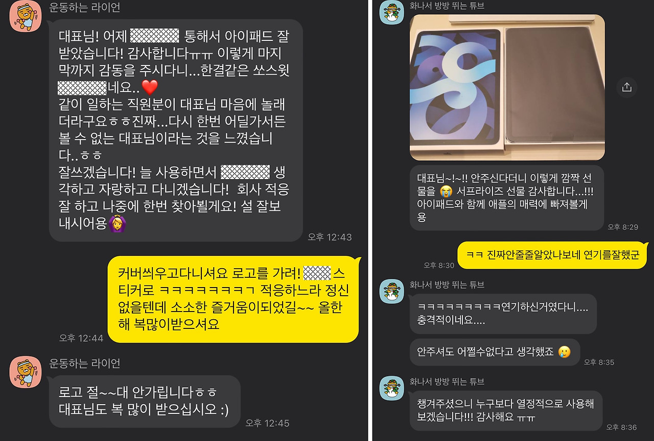 뜻밖의 퀵 배송을 받은 직원들로부터 곧바로 카톡이 도착했다. 사실 고별인사를 하던 당시에 아이패드는 남은 직원들에게 주겠다고 하얀 거짓말을 해놓은 상태라 전혀 예상 못한 듯 감사의 메시지를 보내주었다. 나의 깜짝 서프라이즈는 이렇게 대성공을 거두었다. 퇴사한 직원들과 이렇게 따뜻한 카톡을 나눌 수 있다는 것만으로도 정말 감사한 일이었다. 앞으로 또 우리가 어디서 어떻게 만날지 모르는 일이기에 항상 모든 인연을 소중히 여기는 나의 철학이 반영된 행동이다.
