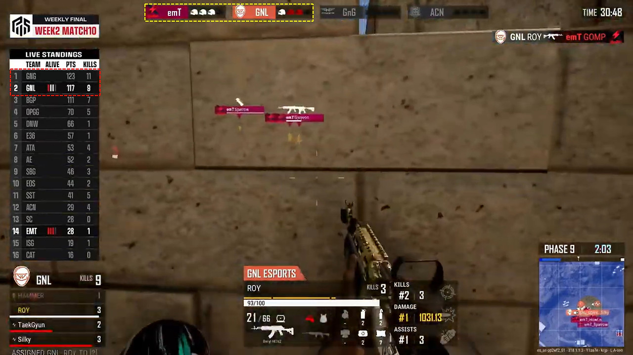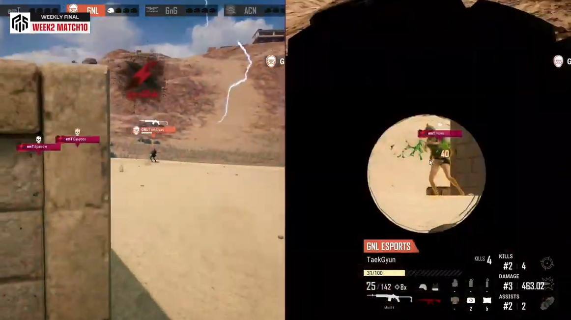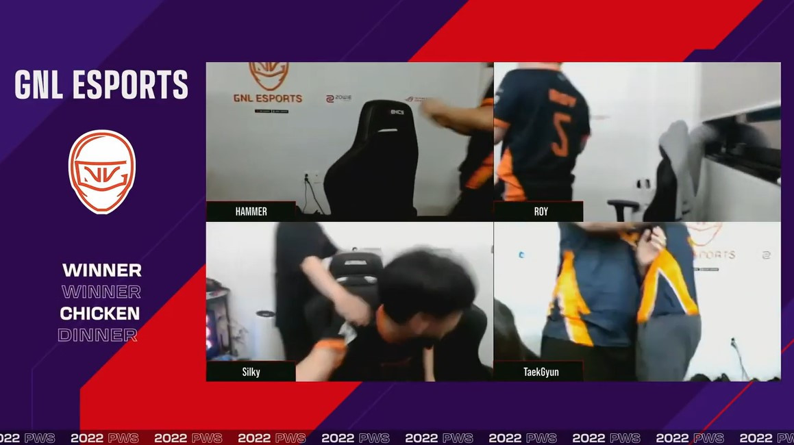 마지막 한 팀까지 잡아내면 위클리 파이널 우승이 되는 상황이었지만 상대팀은 3명이 남아있는 반면, GNL은 1명만 살아있고 2명은 기절을 한 상태였기에 절대적으로 불리한 상황이었습니다. 하지만 여기서 기적 같은 일이 벌어졌습니다. GNL은 침착하게 기절한 1명을 살리고, 반대로 상대팀 2명을 기절시키며 전세를 역전시켰습니다. 그리고 최종 1:1 대치 상황에서 침착하게 상대방을 잡아내며 치킨을 먹으며 단 1점 차이로 위클리 파이널 최종 우승을 차지하게 되었습니다.