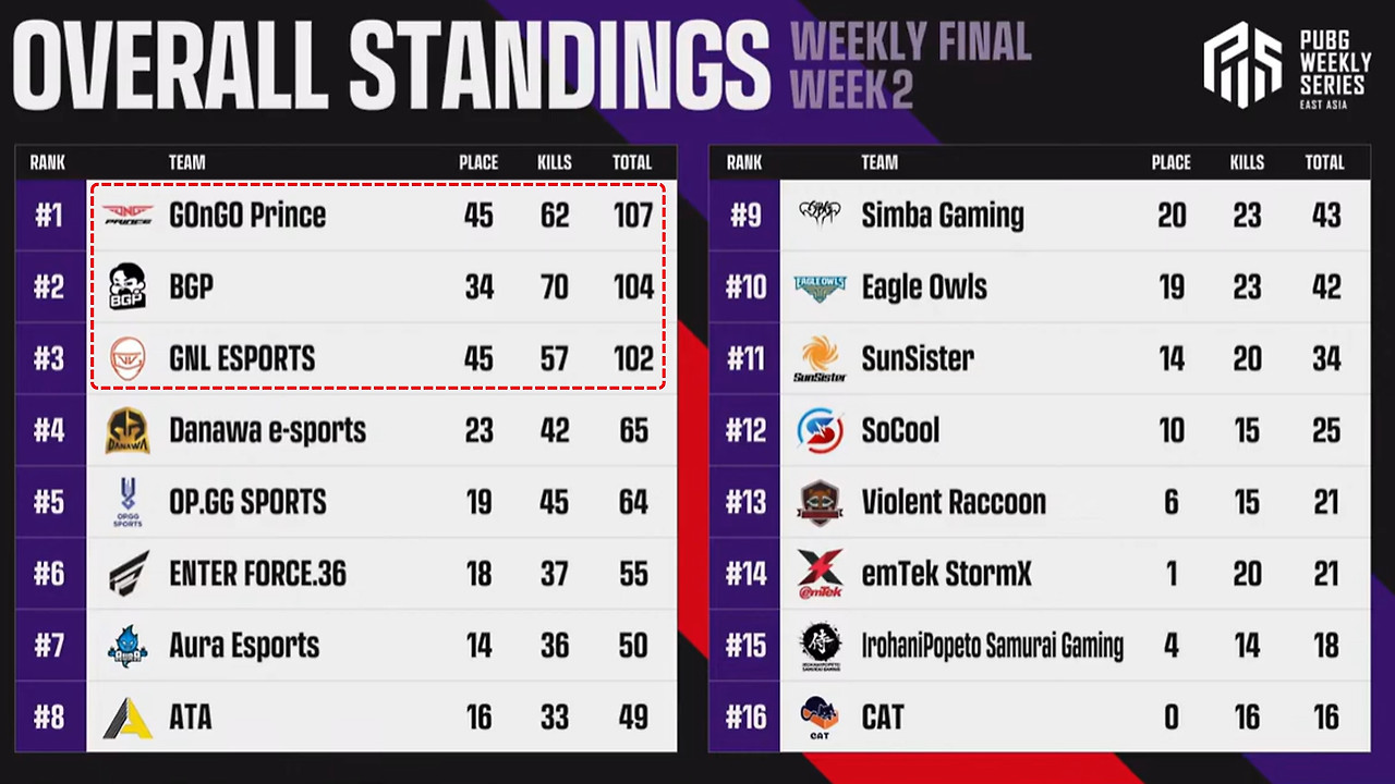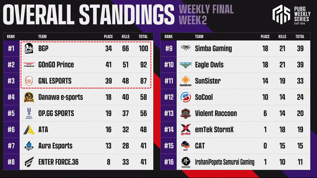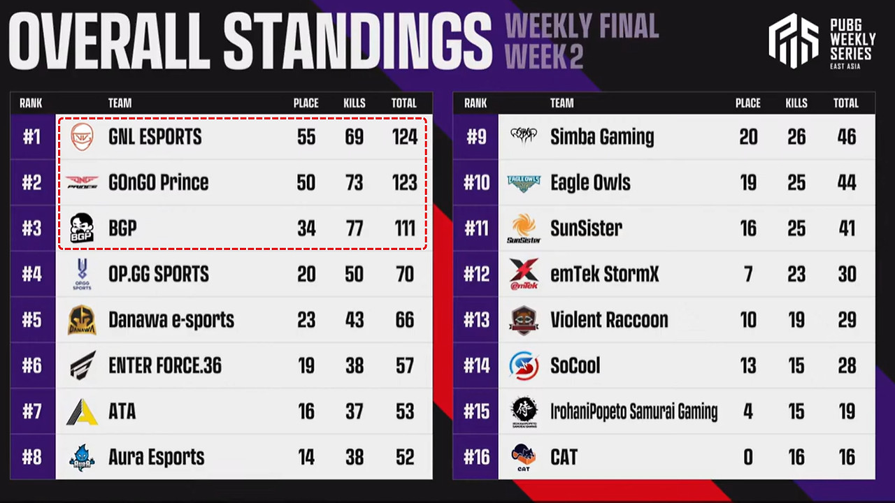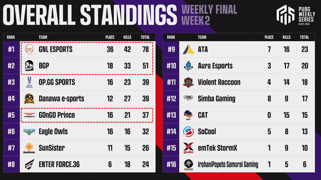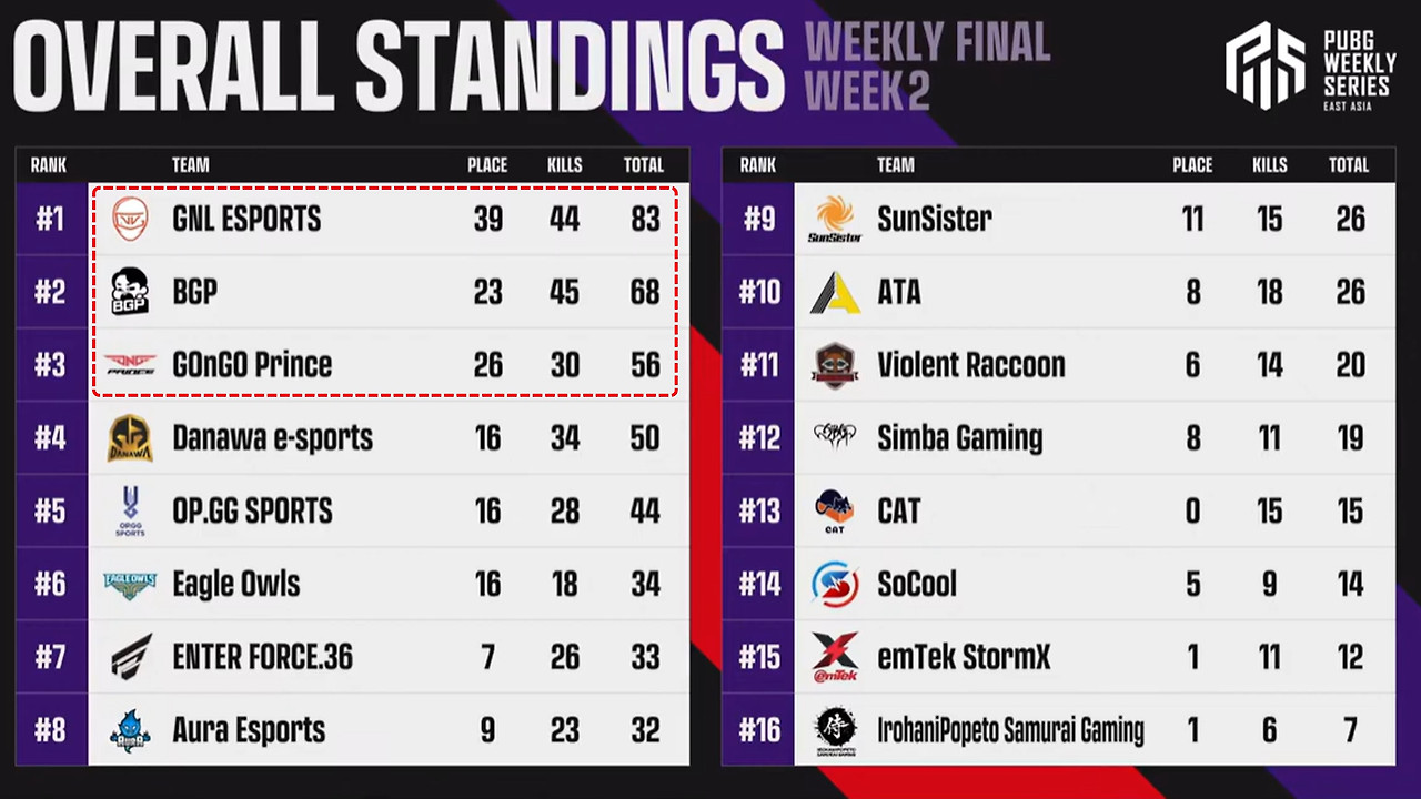 GNL팀은 1주차 위클리 서바이벌에서 8위안에 입상하지 못해 위클리 파이널 진출에 실패했습니다. 2주차 위클리 서바이벌에서는 단 1점차로 8위를 기록하여 간신히 턱걸이로 위클리 파이널에 진출하게 되었습니다. 아무래도 GNL이 신생팀이고, 또 올해 초 기존 선수들이 타팀으로 이적하는 아픔을 겪은 뒤, 전체 선수가 신인으로 교체되는 바람에 항상 약체로 분류되었었습니다. 2주차 위클리 파이널이 시작되자 대반전이 일어났습니다. 1일차 5경기에서 3경기 우승(게임상에서 '치킨 먹었다'라고 표현합니다)하고 1경기에서는 2위를 하는 등 압도적인 경기를 펼치며 2위와 27포인트 차이로 1일차를 마감했습니다. 어느 누구도 심지어 본인들 조차 예상하지 못했던 이변이었습니다.