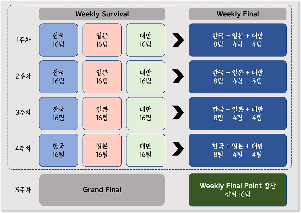 창단부터 현재까지 수많은 사연들이 있었지만 그 부분은 나중에 길~게 풀어보기로 하고, 오늘은 이번에 참여한 대회에서 일어난 기적 같은 사건에 대해서 한번 이야기해보려고 합니다. 매주 수요일-목요일(위클리 서바이벌)에 한국팀 16팀이 경기를 펼쳐 선발된 상위 8팀과 같은 방식으로 선발된 일본 상위 4팀 대만 상위 4팀까지 총 16팀이 토요일-일요일(위클리 파이널)에 대회를 펼쳐 위클리 우승자를 가리는 방식으로 총 4주간 대회가 진행되며, 4주간의 위클리 파이널 점수를 합산하여 상위 16개팀이 마지막 그랜드 파이널을 통해 최종 순위 및 다음 상위 대회 진출팀을 가리게 됩니다.