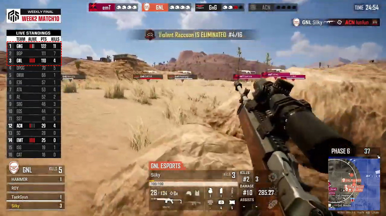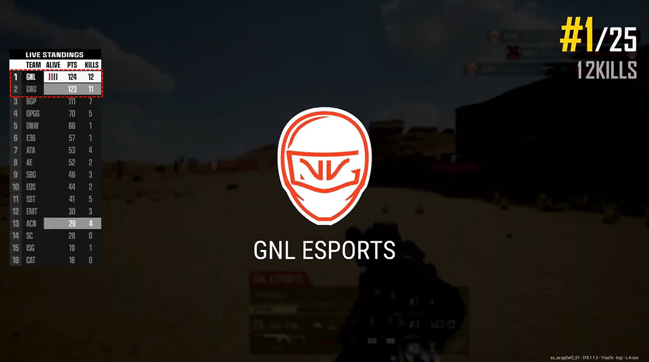 4개팀이 살아남을 때까지 무려 12점 차이까지 나며 3위 GNL의 우승 가능성은 희박해졌습니다. GNL이 우승할 수 있는 단 하나의 조건은 남아있는 8명을 모두 직접 잡아내고 치킨을 먹어야 하는 것이었습니다. 물론 경기 중인 선수들은 이런 세부 조건을 알 리가 없었습니다. 중계진과 시청자들은 모두 GNG와 GNL의 승부에 여러 가지 경우의 수와 조건들을 따지며 열띤 응원을 했습니다. 결국 GNL은 1위팀 GNG와 ACN까지 모두 잡아내며 마지막 승부처를 맞이하게 되었습니다.
