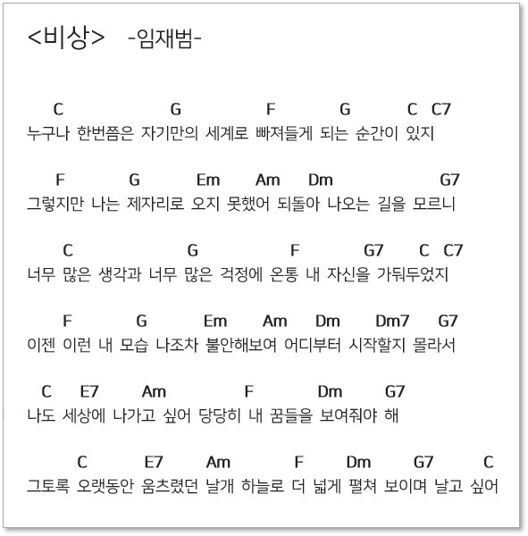 노래의 완성도에 비해 아주 기초적인 코드로 구성이 되어있어, 첫 노래로 임재범의 <비상>을 정해보았다. 기타를 처음 입문하는 사람들에게 아마도 엄청나게 도움이 될 것이다. 단, 원키 자체가 C코드이고 최고음이 '솔#' 이므로 가창력이 부족한 남성 분들에게는 추천하고 싶지 않다. 키를 좀 낮춘다 하더라도 A코드로 하기엔 난이도 있는 코드가 많고, G코드로 가기엔 음이 너무 낮아져 이래저래 C코드 외엔 추천할만한 코드가 없는 것이 단점이라면 단점이다.