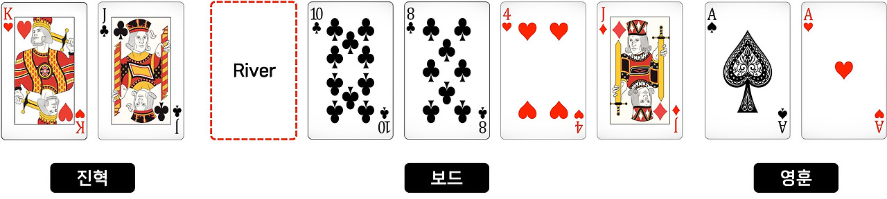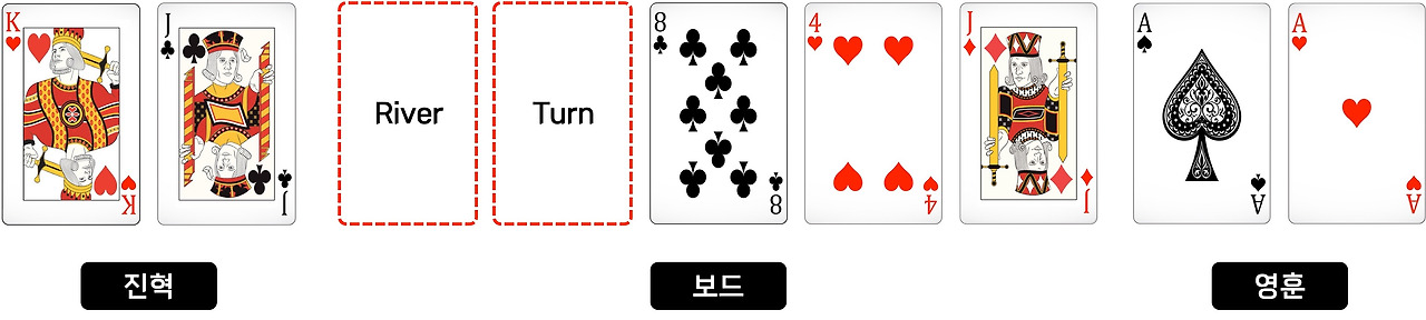 플랍에서 J♦︎가 떨어지면서 진혁은 J 페어를 맞추긴 했지만 여전히 영훈의 AA를 넘기엔 역부족이었다. 진혁이 역전을 하려면 K와 J 단 두 개의 카드뿐이었다. 하지만 만약 K가 나온다 하더라도 나머지 한 장이 8 혹은 4가 나올 경우 영훈이 A 투페어로 승리하게 된다.