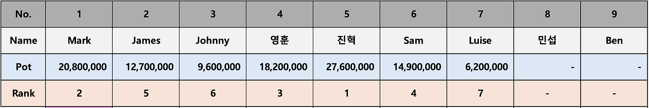 영훈은 정신이 번쩍 들었다. 영훈이 쓸데없는 감상에 빠져 있는 동안 2명의 탈락자를 제외하면 자신이 꼴찌에서 2번째의 위치에 놓이게 되었다는 사실을 자각하게 되었다. 아직 중반전이긴 하지만 블라인드도 계속 올라가고 있는 와중에 자신이 가진 스택으로는 제대로 힘을 쓸 수가 없기 때문에 이번 판을 꼭 가져와야겠다는 생각을 했다.