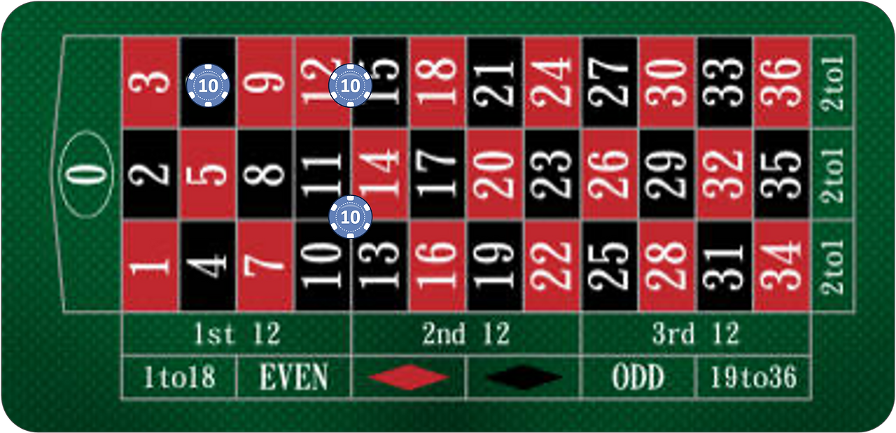 룰렛의 룰은 의외로 간단했다. 숫자에 베팅을 하면 각각의 배수를 받게 되는데 한 칸에 베팅하면 36배, 두 칸에 걸쳐서 베팅하면 18배, 네 칸에 걸쳐서 베팅하면 9배를 받는 식이다. 또 1st 12(1~12), 2nd 12(13~24), 3rd 12(25~36)에 베팅했을 때 해당하는 숫자가 나오면 3배의 배당을 받게 되고, 검정♦ or 빨강♦에 베팅하거나 홀수(ODD) or 짝수(EVEN), Low(1~18) or High(19~36)에 베팅할 경우 2배의 배당을 받는다.