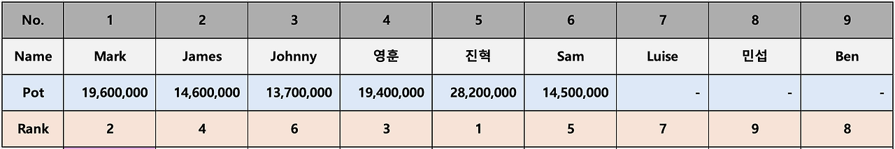분명 턴까지만 해도 Luise가 9 셋으로 앞서 있었고, John은 그저 수동적으로 따라가기만 했었는데 마지막 리버에서 10♦︎가 떨어지면서 스트레이트로 대역전승을 거뒀다. Luise는 아쉽게 역전패하면서 파이널 테이블 최종 순위 7위로 경기를 마감하게 되었다. 그렇게 전반 마지막 경기가 짜릿한 역전 승부로 끝이 났고 선수들은 잠시 Break Time을 갖게 되었다.