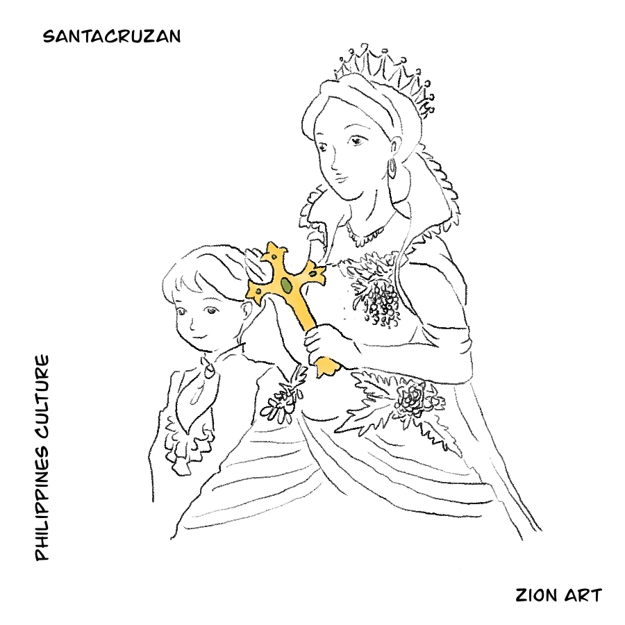 필리핀은 5월이 되면 Flores de Mayo(Flowers of May)라고 하여 한 달간 축제를 펼친다. 이 축제는 가톨릭과 관련된 것으로 성모 마리아를 기념하는 것이다. 성모 마리아를 위해 기도하거나 헌화를 드리기도 한다. 그중에서 산타크루잔은 마지막 열리는 종교-역사적 퍼레이드 또는 미인대회라 할 수 있다. 이는 성 헬레나와 최초 기독교 로마 황제가 된 그녀의 아들 콘스탄틴에 의해 만들어진 것으로 예수님의 십자가를 발견한 것을 기념하기 위해 개최된다. 산타쿠르잔은 1800년 중반에 시작되었다. 전설에 의하면, 75세인 여왕 헬레나는 예수님의 십자가를 직접 보고 싶어 사람을 보내었고, 3개의 십자가를 발견했는데, 그중 하나는 진짜 예수님의 십자가로 병든 하인을 치유했다고 한다. 요즘은 각 동네마다 예쁜 아가씨들이 드레스를 입고 퍼레이드를 하는 미인대회로 바뀌었으나 그 의미는 여전히 간직하고 있다고 한다. 이 퍼레이드는 여왕 역할을 하는 사람 이외 중요 역할을 맡은 사람들이 있다. 므두셀라는 노인으로 우리가 항상 먼지로 돌아가는 것을 상징한다. 사마리아 여인은 예수님이 야곱의 우물에서 만난 여자로 구원은 신자가 아닌 모두를 위한 것임을 상징한다. 애타는 지역 집단의 일원으로 분장하는데, 이는 기독교 신앙을 받아들인 집단을 대표한다. 베로니카는 예수님의 얼굴을 닦은 여인으로 예수님의 얼굴이 3번 찍힌 베일을 들고 다닌다.
