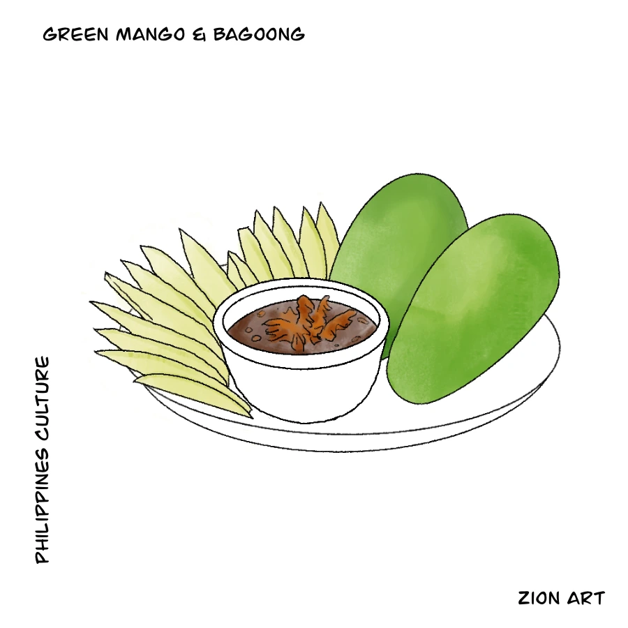 그린망고는 따로 품종이 있는 것은 아니고, 노랗게 익기 전의 망고이다. 과육이 조금 딱딱하고 새콤한 맛이 강하다. 필리핀에서는 이 그린망고를 바고옹에 찍어 먹는다. 바고옹은 새우젓으로 만든 조미료라 할 수 있다. 볶은 토마토, 양파, 마늘에 새우젓과 설탕, 식초를 넣어 아주 약한 불에 약 10-15분 끓여 만든다. 새우젓은 한국과는 달리 생선 액젓(파티스, patis)에 작은 새우들을 넣어 발효시킨 것이라 한다. 그린망고의 신맛과 짭조름한 바고옹이 조화로운 맛을 낸다. 그린망고, 토마토, 양파에 바고옹을 섞으면 간단한 망고 샐러드가 되기도 한다. 바고옹은 밥과 비벼먹기도 한다. 그 맛이 살짝 달콤하면서 짭조름한 것이 밥도둑이 된다. 대형 마트에 가면 바고옹을 판매하는 데 필리핀을 방문하게 된다면 작은 병의 바고옹을 구입해서 필리핀의 맛을 즐겨보시길 권한다.
