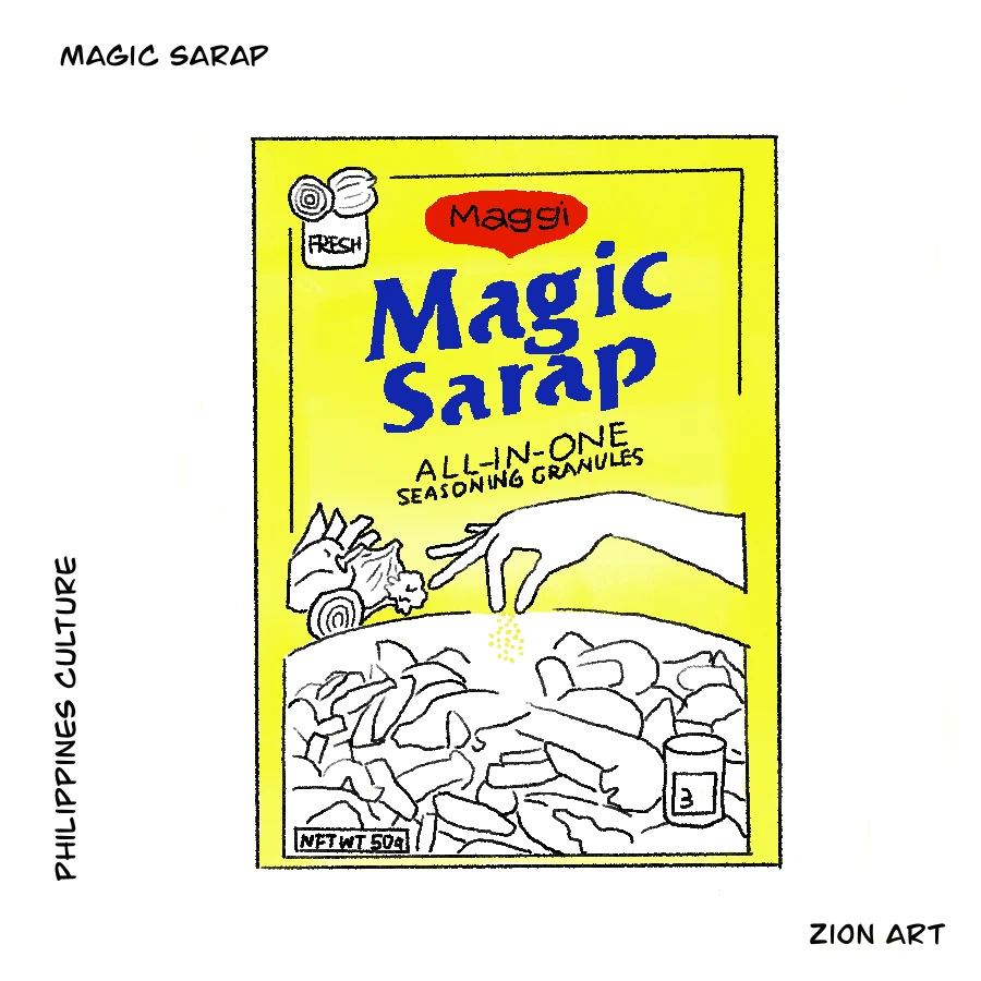 필리핀에 와서 필리핀 요리가 궁금하여 현지 분에게 여쭤보았다. 대부분의 레시피들은 비슷했다. 먼저 마늘, 야채, 고기 등의 재료를 기름에 볶고 물을 넣어 끓인 후 간장이나 조미료를 넣으면 끝났다. 어느 요리에서나 빠지지 않는 것이 바로 이 매직 사랍이다. 조미료라고 하기에 연노랑색 가루가 굉장히 인공적인 느낌이다. 요리를 하다가 맛이 나지 않으면 이 매직사랍을 조금씩 더 추가한다. 제목 그대로 마법의 가루가 필리핀의 가정식 맛을 이끌어낸다. 요즘은 이 매직사랍으로 한국요리도 한다고 광고한다. 아직 시도는 못해봤지만 조미료니까 비슷한 맛이 나겠지 싶다. 국민 조미료답게 가난한 서민들도 살 수 있도록 낱개 포장하여 판매한다. 큰 마트부터 동네구멍가게인 사리사리 스토어까지 빠지지 않는 품목이다.