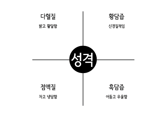 원초아, 자아, 초자아는 무의식적 욕망을 실현해가는 과정 곧 자아 시스템과 같고 이 자아 시스템은 우리의 성격 시스템이다. 이 원초아, 자아, 초자아의 균형에 따라 우리는 원초아적인 인간이 될 수도 있고 원초아와 자아의 균형점을 가진 인간이 될 수도 있으며 원초아가 배제된 초자아적인 인간으로 살 수도 있다. 여기서 중요한 것은 우리의 이러한 자아 시스템을 알고 기계적 작동에서 벗어나는 것이다. 즉 성격적 인간의 모습에서 자유로워져야 한다. 예를 들어 누군가 당신을 백 원이라는 동전 하나로 간단하게 제어할 수 있는 자판기와 같은 존재로 설계했다면 당신은 백 원의 가치 속에 구속되어 영원히 백 원짜리 신세로 살 수밖에 없을 것이다. 하지만 자판기의 설계를 이해하고 작동원리를 파악했다면 더 이상 백 원짜리 신세로 살지 않아도 된다. 자아 시스템은 당신이 기계적인 인간으로 살기를 거부할 때 언제든지 빠져나올 수 있다. 그것은 일종의 '알아차림'이다. 즉 자신을 알아차리고 관찰함으로써 자신의 기계적인 자동반응에서 벗어나는 것이다. 또한 여기서 하나 더 알아야 할 것은 인간의 신체적 특징이다. 자신을 더 잘 알아차리고 벗어나려면 자신의 신체적 특징 또한 파악해야 한다. 인간의 타고난 신체적 특징이 한 인간의 기질과 성격에 중요한 영향을 준다는 것은 '히포크라테스(Hippocrates)'의 '심신상관론'에 근거한 '네 가지 체액론'이다. 히포크라테스는 그리스 희랍의 최초 의학자로서 인간의 몸속에 흐르는 체액에 따라 인간의 성격도 달라진다고 보았다. 히포크라테스가 밝혀낸 체액과 그 체액에 따른 네 가지 기질, 성격은 다음과 같다.