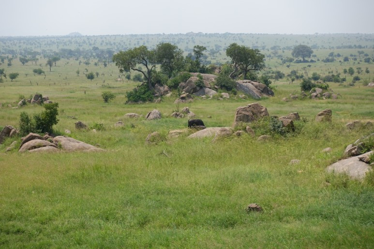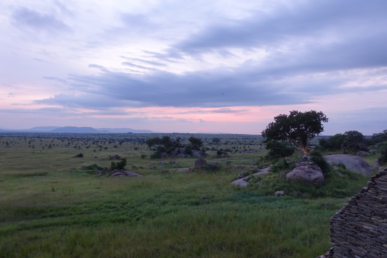 해질녘의 세렝게테 초원 - 점점이 찍힌 건 먼지가 아니고 새들이다. 들판의 수풀 가운데 쯤에 버팔로가 있다.