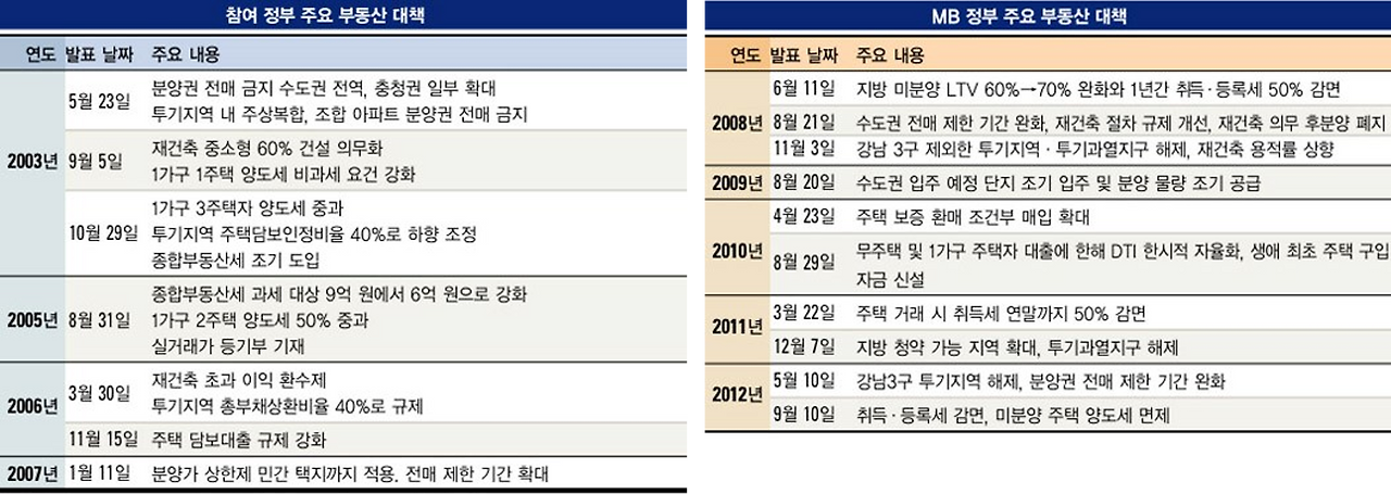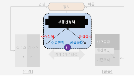 그동안 무서운 속도로 성장해온 한국경제는 부동산 시장을 어마어마한 힘으로 뽐뿌질 해왔기 때문에 정부정책은 이러한 주체할수 없는 시장 폭발력을 억누르는 일에 집중되어 왔다. 국가는 고용, 수출, 물가, 외환 및 금융, 부동산시장 안정을 위해 종합적인 재정과 통화 정책을 펼치는데 국가 경제의 큰 틀에서 부동산 정책이 여기에 포함되기도 하고 사안에 따라 부동산 시장에 특화된 정책들이 더해져 정책의 효과를 높인다. 정부가 꺼내드는 카드는 크게 부동산규제와 세금을 통한 수요 억제다.