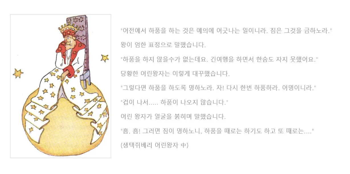 '어린왕자'에 나오는 '이상한 왕'은 백성이 한명도 없는 나라를 다스리는 왕이다. 원리 원칙 보다는 상황에 맞춰 명령과 규칙을 이렇게 저렇게 바꾸는데 그의 지시를 따르는 이는 아무도 없다.