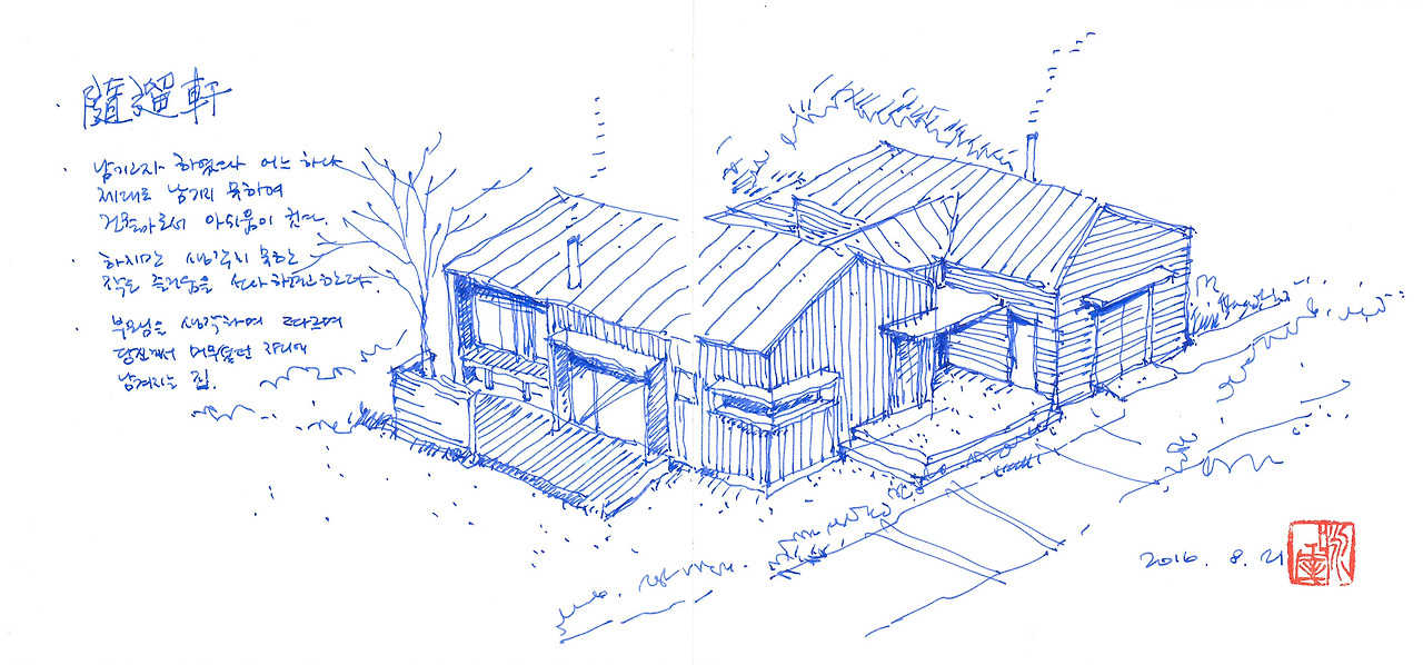 그 어떤 건축가도 그렇게 잘 다듬어진 흔적을 지워내고 새로운 공간으로 돌아와 온전히 예전처럼 지낼 수 있을 것이라고 생각지 않는다. 그것도 도시 생활을 내려놓고 돌아온 고향에서 그리고 유일하게 당신께서 남겨놓으신, 당신과 공유했던 시간이 존재하는 그런 장치를 남겨 놓은 것은 당연지사였다.