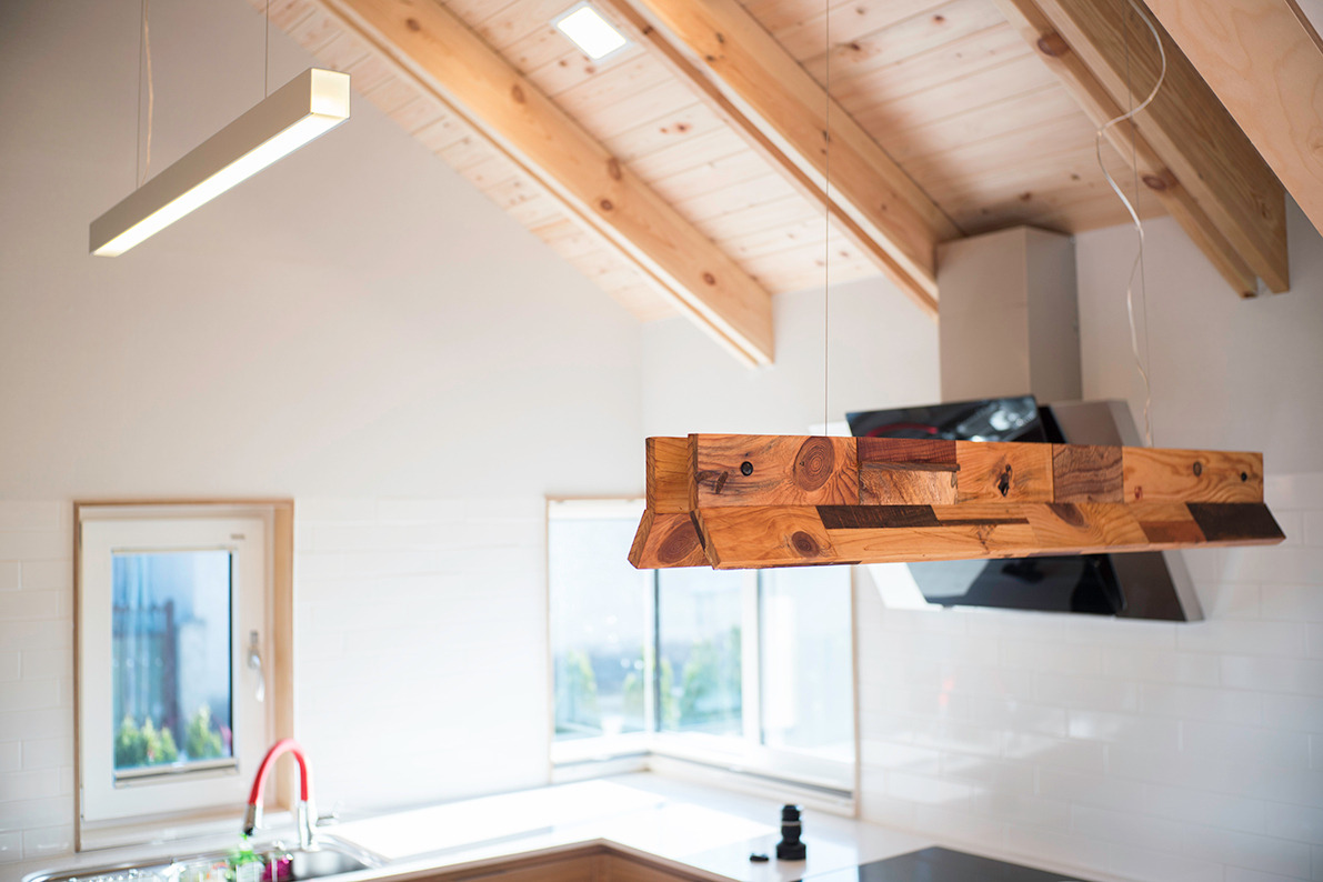 곳간의 목재 판문은 식탁을 비추는 조명으로 재활용되었다. 언제나 서로 바라볼 수 있는 자리에 낮게 걸었다. 저 조명은 이 집의 모두가 되었다.