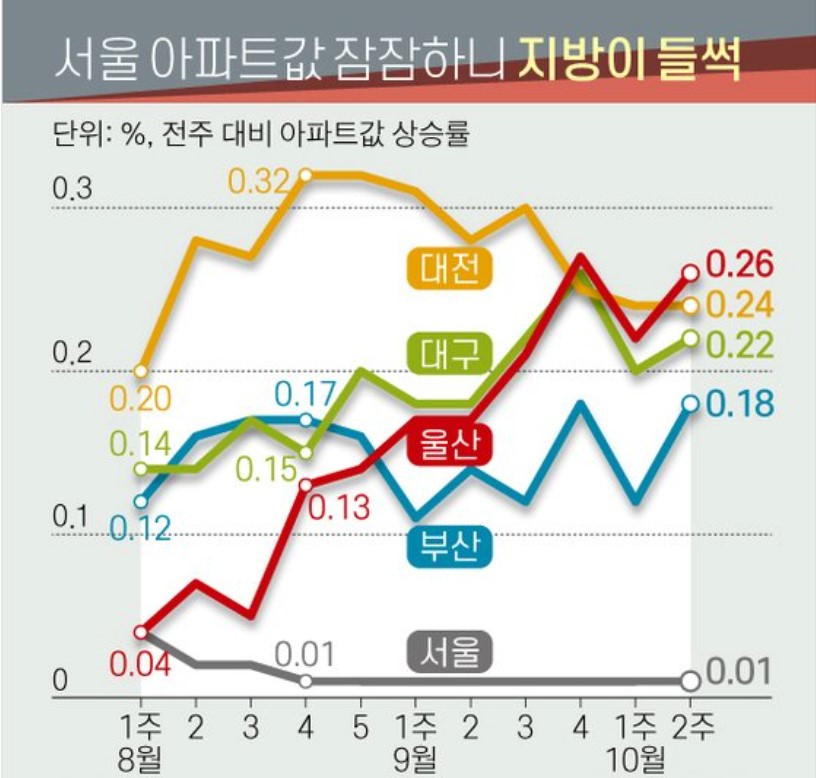 기본적으로 서울과 지방의 유동성은 반대로 나타나는 경우가 일반적인데, 그동안 서울 부동산에 머물렀던 시중 유동성이 지방으로 자연스럽게 흘러갔다는 것을 이유로 들 수 있다. 서울은 7.10대책으로 인한 규제 강화로 인해 매수세가 둔화했고, 이에 반대로 그 유동성이 지방으로 흘러갔다는 의미이다.
