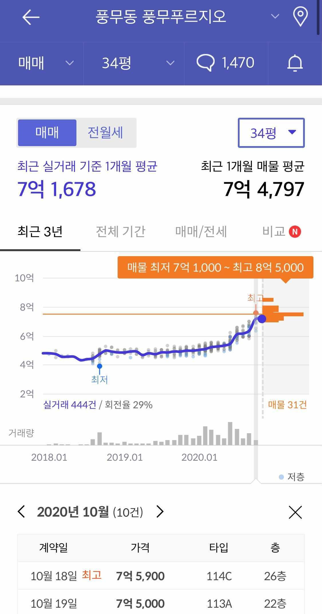 이를 반영하여 대장 아파트라고 할 수 있는 풍무 푸르지오도 올해 2월만 해도 4억대 매물이 나왔었는데 8개월이 지난 현재, 34평 기준 7억 5900만 원 신고가를 달성하는 모습을 어렵지 않게 찾아볼 수 있다.