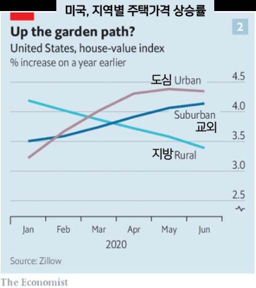 미국의 경우 대부분의 도시에서 도심과 도심 외곽의 주택 가격이 상승추세를 보이고 있는 상황이다. 영국 또한 아파트 가격은 0.9%가 상승한 반면 단독주택의 가격은 1년 전보다 4%가 올랐다고 하니 정원이 딸린 단독주택에 대한 선호가 늘어났다는 것을 볼 수 있다. 즉, 집의 가치가 높아지며 선호도가 높은 집에 투자하는 비용이 더욱 증가하게 되는 것이다.