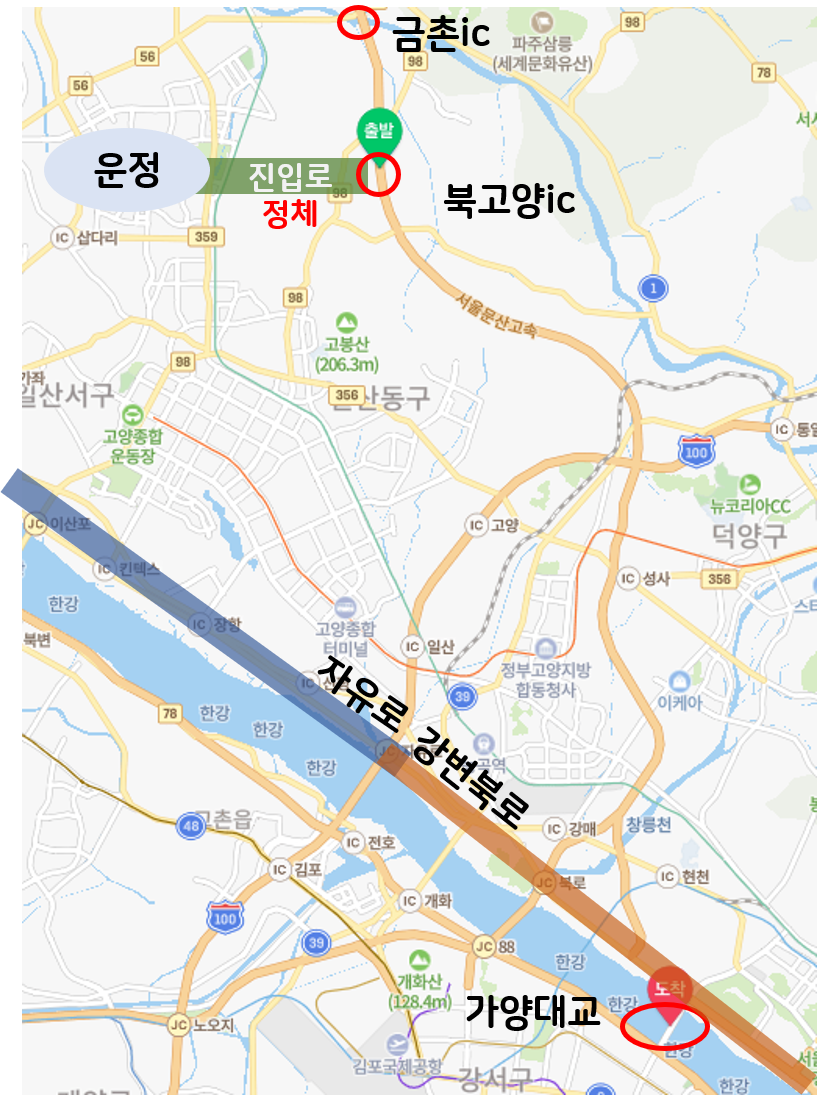 파주, 일산에서 서울로 들어오는 사람이 많아 서울방향으로의 정체가 나타나고 있다. 그 정체지점이 하나가 아니라는 것도 문제다.