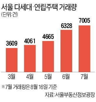 이런 현상이 벌어지는 가장 큰 이유는 정부의 규제가 아파트에 집중되면서 대출이 어려워진 반면, 빌라 등의 다른 주택에 대한 규제는 없기 때문이다. 그리고 가격도 아파트에 비해 저렴한 편이다. 중개업소에 따르면, 빌라는 비슷한 면적에 인접한 아파트의 60% 미만의 가격에 거래가 된다고 한다. 서울 시내 아파트 전세가가 60%에 달한다는 것을 생각하면 아파트 전세금에 좀 더 돈을 보태면 근처의 빌라를 매입할 수 있다는 뜻이다. 실제로 빌라 선호현상은 통계로도 입증된다. 지난 1~5월까지 다세대/연립주택 거래랑은 3~4000건 수준에 머물렀지만, 6월 6천건으로 급등하더니 7월엔 7천건을 넘어섰다. 덩달아 매매가도 상승세를 이어가고 있다.