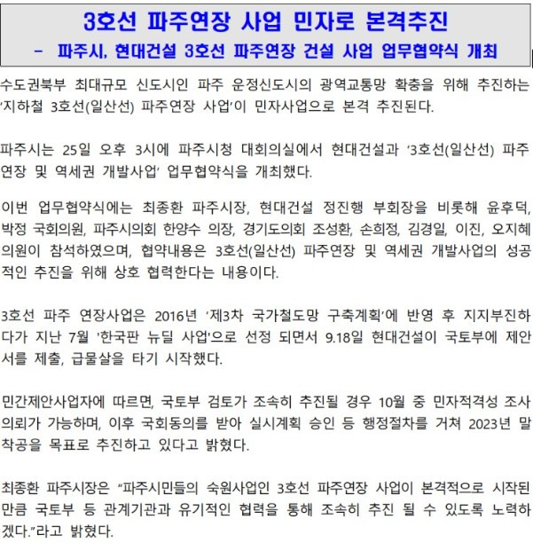 최근 경기 파주시가 운정신도시 광역교통망 확충을 위해 추진하는 지하철 3호선 파주 연장 사업을 민자 사업으로 현대건설과 함께 추진한다고 발표했다. 지난 9월 현대건설은 국토교통부에 3호선 파주 연장사업 민간제안서를 제출했는데, 현대건설이 제안한 사업안에 대해 아직 구체적으로 공개된 것은 없다. 현재 현대건설의 제안서는 민간제안서 검토 절차가 끝나 다음 단계인 민자적격성 조사 절차를 밟고 있는데, 6~12개월가량 소요되는 민자적격성 검사를 통과하면 우선협상대상자 선정과 국회 동의를 거친 후 실제 건설될 노선이 확정된다.