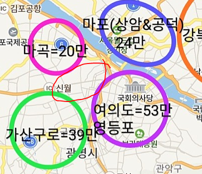 왼쪽 사진에서 빨간 동그라미로 표시된 지역이 양천구이고 중심 업무지구에 둘러싸여 있다. 마포에는 24만, 여의도는 53만, 가산구로는 39만, 마곡은 20만의 일자리가 있으며 일자리 수의 총 합은 136만이나 된다.