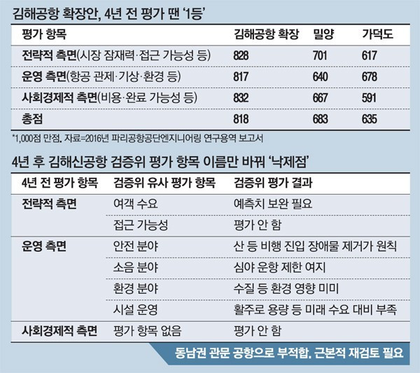 그러나 아이러니 한 것은 4년 전 ADPi평가에서 김해신공항이 높은 점수를 받았던 항목인 경제성과 접근성은 이번 검증에서 제외되었다는 것이다. 2016년 프랑스 파리공항공단엔지니어링(ADPi)이 진행한 사전 타당성 연구 용역에서 김해공항은 공항 운영과 성장 가능성, 접근성 등을 반영한 각종 시나리오에서 817~832점을 받아 밀양(640~701점)과 가덕도(591~678점)를 크게 앞섰다.