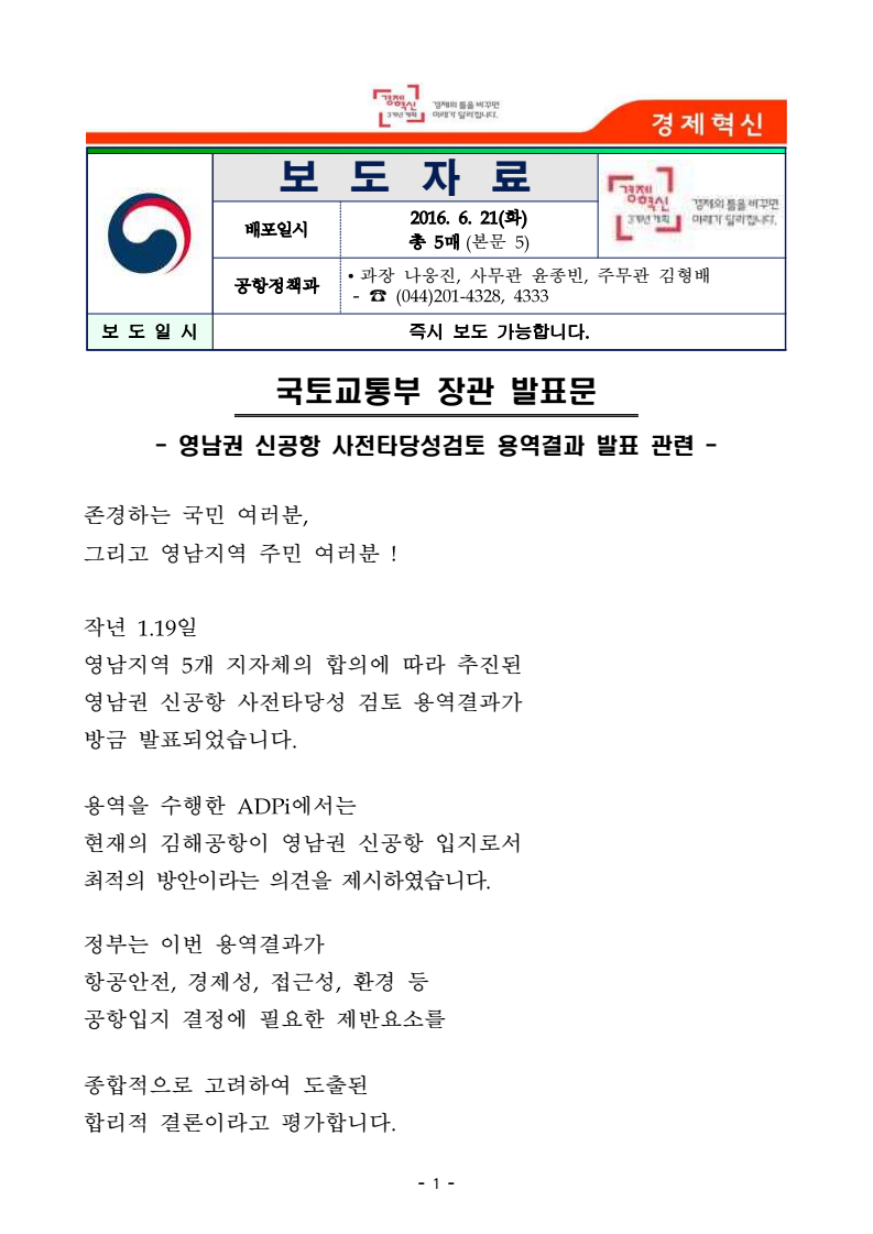결과는 김해공항의 승이었다. 2016년에 ADPi로부터 김해가 항공안전, 경제성, 접근성, 환경 등 공항입지 결정에 필요한 제반요소들을 종합적으로 고려했을 때 가장 우수하다고 평가를 받았다. 그렇게 2016년 6월, 김해공항 활주로를 확장하는 ‘김해신공항안’을 확정했다. 국토부는 2021년에 김해신공항을 착공하고 2026년에 문을 열 계획이었다.