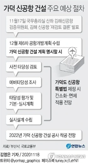 이미 결정된 사항이었던 김해 신공항 건설을 4년 만에 백지화했지만 그렇다고 가덕 신공항을 뚝딱 건설할 수는 없는 노릇이다. 가덕 신공항 건설을 위해선 먼저 5년 단위로 수립하고 있는, 다음달 예정인 ‘제6차 공항개발계획’에 가덕신공항 건설 계획을 명시해야 한다. 이 때, 공항개발계획에 포함되지 못한다면 가덕신공항 건설은 생각보다 더욱 늦어질 수 있다. 명시한다 하더라도, 사전 타당성 검토, 예비타당성 조사, 타당성 평가 및 기본·실시계획 수립, 실시설계수립, 착공 등 절차를 밟아 장기전으로 7~8년을 소요될 것이다.