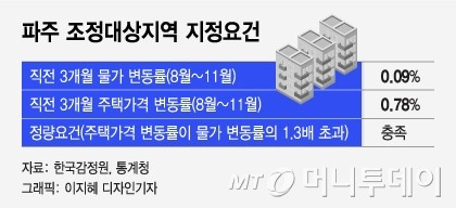 경기도 김포에 이어 파주도 조정대상지역으로 지정될 가능성이 높아졌다. 파주는 집값 과열지역 중 하나로 꼽혔으나 그간 정량요건에 미달해 규제를 받지 않았다. 하지만 11월을 기점으로 직전 3개월 집값 상승률이 0.78%로 물가 변동률의 1.3배를 초과하며 정량요건을 충족했다.