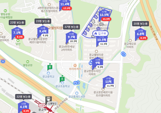 위 사진처럼 광교역 주변에 10억이 넘는 아파트들이 꽤나 많은 것을 알 수 있다. 이는 광교가 포함되어 있는 수원시에서도 가장 비싼 축에 속한다. 광교의 집값이 이렇게 비싼 이유는 신축 인프라가 잘 갖춰진 것도 있지만 강남접근성이 굉장히 높은 것 역시 큰 영향을 미친다. 그만큼 광교의 높은 집값 형성에는 신분당선의 지분이 큰 것이다.