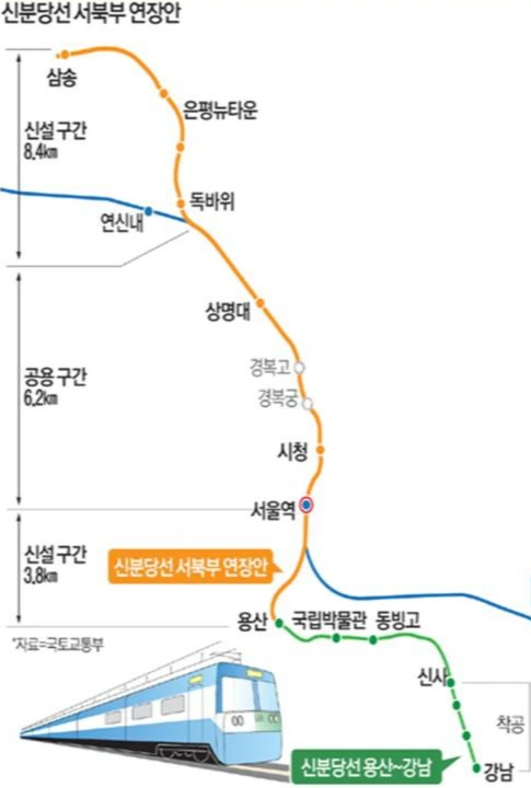 한편 서울시는 도심과의 접근성이 매우 떨어져 교통적인 불편을 호소해왔던 은평구의 교통을 개선하기 위해서 다양한 시도를 하고 있다. 여러가지 시도 중에 신분당선을 동빙고역에서 분기해 광화문~은평 뉴타운~삼송역을 이으려는 노력이 있다. 하지만 2017년 자체적으로 타당성 조사를 실시한 결과 두 구간 모두 1점대를 넘지 못했다. 이를 해결하기 위해 서울시 측은 새로운 수요분석자료를 기준으로 타당성에 대해 재검토를 할 것이라 밝혔다. 그렇게 해서 진행된 조사로 용산-서울-시청-상명대-독바위-삼송을 잇는 19.42km의 노선의 B/C값은 0.86이 나왔다.
