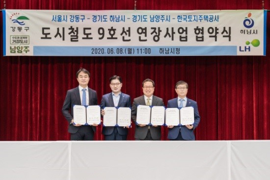 강동구는 고덕비즈밸리, 강동일반산업단지 개발이 끝나는 오는 2024년 인구가 55만 명까지 늘어날 것으로 예상돼 교통량 증가에 따른 대책 수립 필요성이 제기돼 왔다. 이렇듯 서울 강동구는 지하철 9호선 4단계 연장사업을 원활하게 추진하기 위해 경기 하남·남양주시, 한국토지주택공사(LH)와 업무협약(사진)을 체결했다고 지난 6월 초 밝혔다. 이정훈 강동구청장은 “인구가 계속해서 유입되는 만큼 주민들이 편리하게 대중교통을 이용할 수 있도록 기반 시설 확충을 위해 힘쓰겠다”라고 말했다.