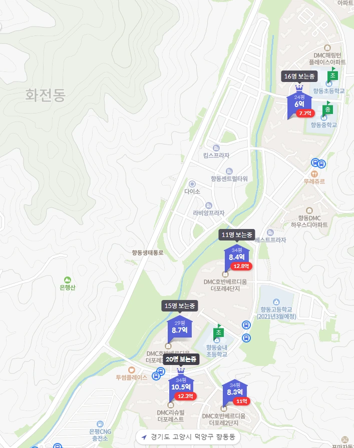 한 중개업자에 따르면 덕양구 향동 'DMC중흥S클래스더센트럴(전용면적 60㎡)'의 최근 1개월 평균 시세는 7억원이라고 말했다. 지난해 평균 시세보다 3억원 가량이 오른 셈이다. 이 근처의 'DMC호반베르디움더포레(전용면적 71㎡)'는 지난해 12월 9억원에 거래 되었는데, 이는 3개월 전 보다 1억5000만원 가량 상승한 가격이다.