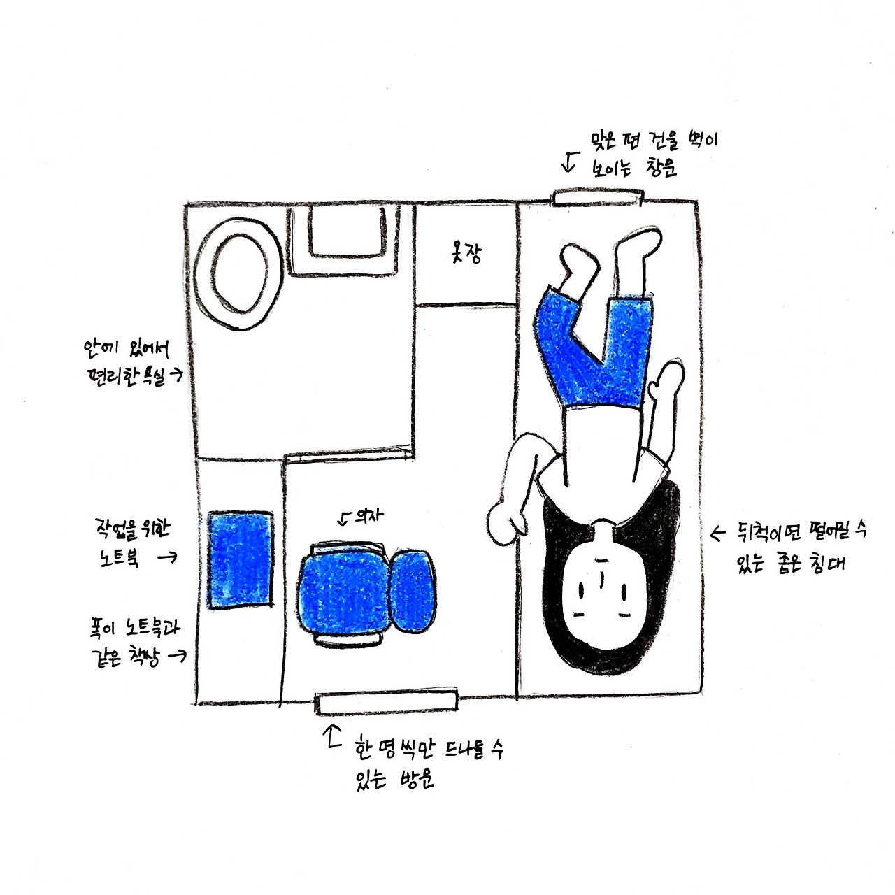 고시원에서 지낸 지 두 달 정도 되었을 무렵 확실히 방이 좁긴 좁구나 싶었다. 들여놓는 물건이 점점 늘어나자 물건을 놔둘 공간이 부족해진 탓이었다. 특히 방 한쪽에 TV 받침대 겸 책상으로 놓여 있는 작은 테이블이 있었는데, 그림 작업을 위해 노트북과 타블렛을 동시에 사용하는 나에게는 그 테이블이 좁았다. 상대적으로 TV를 덜 사용하니 고시원 주인아저씨에게 TV를 방에서 빼고 싶다고 하자 아저씨는 TV를 빼기 위해 방으로 왔다.