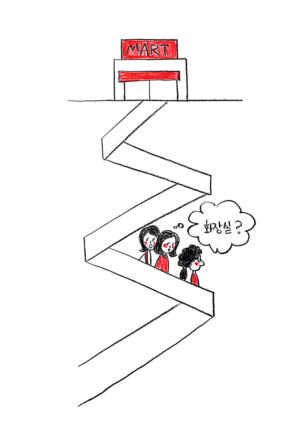 결국 난처한 표정으로 멀뚱히 서 있는데 점원이 희망찬 말을 했다. 직원용 화장실을 안내해 주겠다는 것이다. 그 순간 내 머릿속에는 ‘환희의 송가’가 들려오는 듯했다. 나는 연신 땡큐를 날리며 점원이 얼른 나를 화장실로 데려다주길 기다렸고, 점원은 옆에 있던 동료 점원에게 무어라 말을 한 뒤 나와 쥬쥬에게 자신을 따라오라 했다.