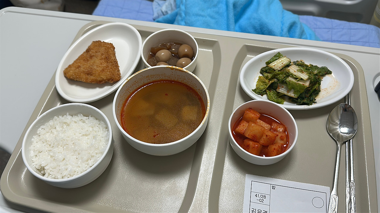 식사를 신청해 두어 밥을 먹었다. 대부분 사람들은 병원 밥이 맛없다던데... 나는 늘 맛있게 먹는 편이다. 아마 남이 해준 밥이라 그런 걸지도... (첫째 아이 병원 입원했을 때 보호자식도 꽤나 맛있게 먹었던 기억이...) 자정부터는 물도 못 마시는 금식에 다음 날도 하루 종일 금식이라 마지막 식사로 생각하고 야무지게 먹었다.