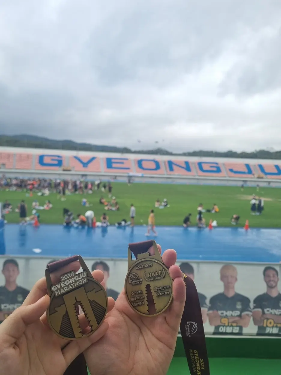 2분쯤 지나서 남자친구도 들어왔고 함께 완주의 기쁨을 나눴다. 짐보관이 있는 운동장으로 돌아오며 메달을 받았고,