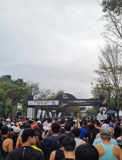 하지만 짐도 좀 늦었지만 8시 즈음 무사히 맡기고(나중에 보니 오히려 다행이었던 게 짐보관이 다 섞여서 짐 찾는 줄이 너무 길었다. 우리는 늦게 맡겨서 맨 바깥쪽에 있어서 빠르게 찾고 나올 수 있었다.) 화장실도 들르고 약간 몸도 풀고, 바로 하프 주자 라인에 섰다. 사실 시간이 없어 몸을 거의 못 풀고 출발했다.