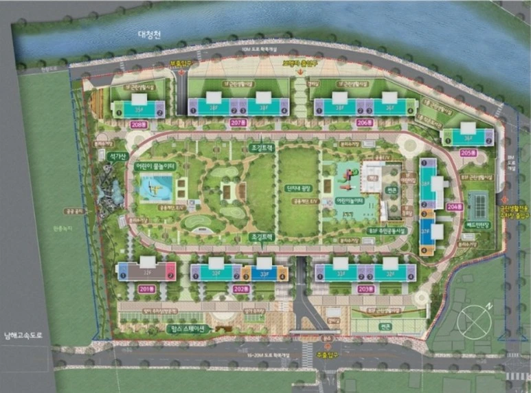 대부분의 건설사 단지배치도를 보면 남북이 기울어 있어요. 정남향처럼 보이게 하려고 조정한거니, 남북 잘확인하셔야 합니다. 김해 대청천경동리인뷰를 보면 대부분의 아파트들이 남동향으로 구성되어 있네요.