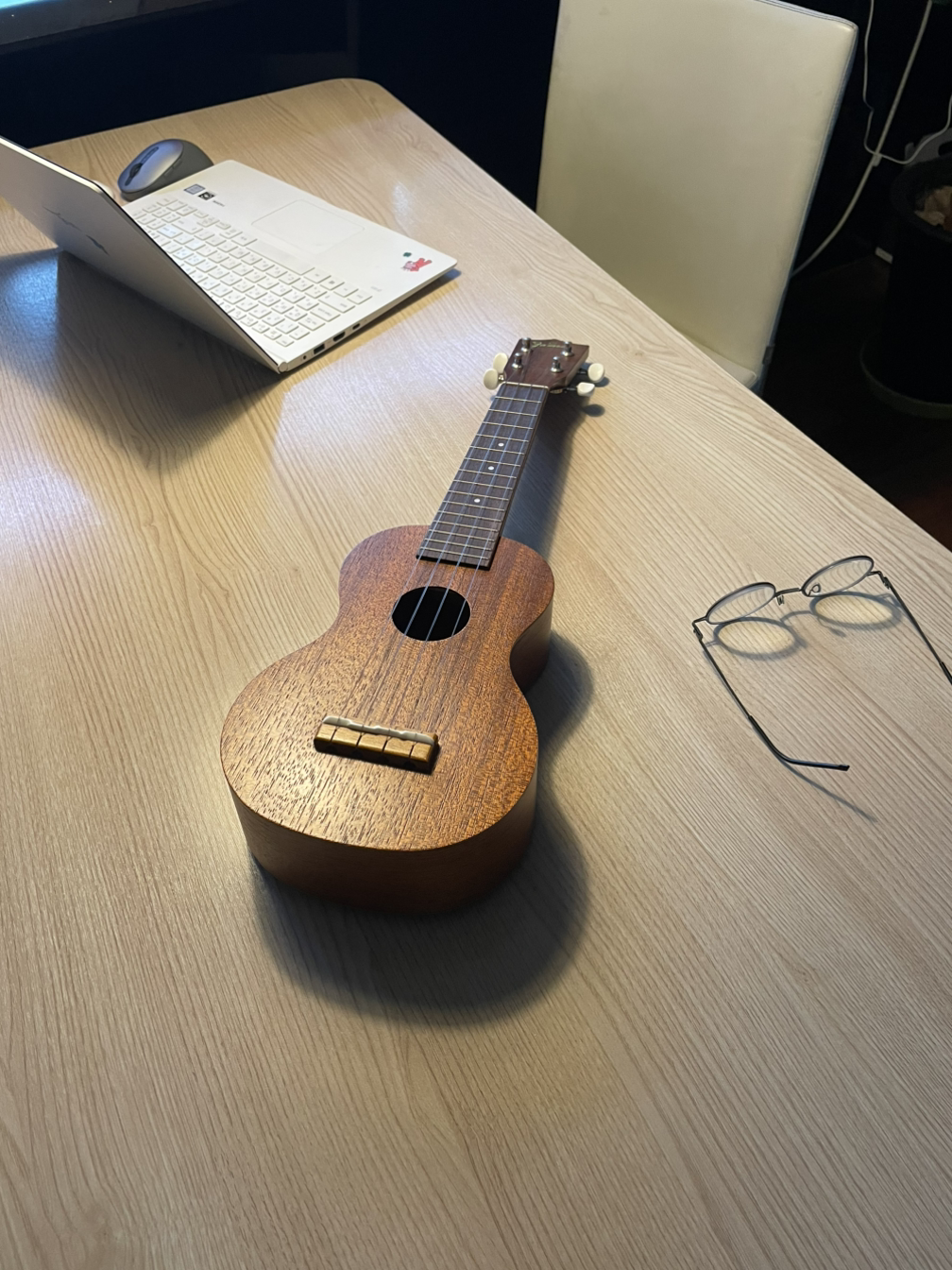 나의 우쿨렐레는 소프라노 음역이고, 줄과 부품 몇 개를 제외하면 악기 전체가 나무로 만들어졌다. 브랜드는 1955년부터 우쿨렐레를 만들었다는 일본 브랜드 FAMOUS, 난 이 친구를 지난 5월 일본 후쿠오카 여행을 갔다가 PARCO백화점 8층에 있는 중고악기 매장에서 만났다. 그곳엔 다양한 크기와 각양각색의 우쿨렐레가 벽 한쪽에 진열돼 있었다. 난 거기 있는 모든 우쿨렐레를 한 번씩 안고 현을 튕겨보았다. 어떤 걸 선택해야 할지 판단할 수 없었다. 한 50년 우쿨렐레만 만들어온 장인이 만든 것 같은 분위기. 디자인도 색깔도 각양각색. 아름답고, 앙증맞다. 하지만 그 멋진 녀석들 중에 바로 이 친구를 품에 안았을 때 왠지 모를 따듯한 느낌이 나에게 전해졌다. 확신했다. 이 친구가 나의 우쿨렐레다. 쳇 GPT는 이해할 수 없는 기준으로 선택된 나의 우쿨렐레. 나는 종종 이 친구와 함께 환상의 세계로 가 공연을 한다.