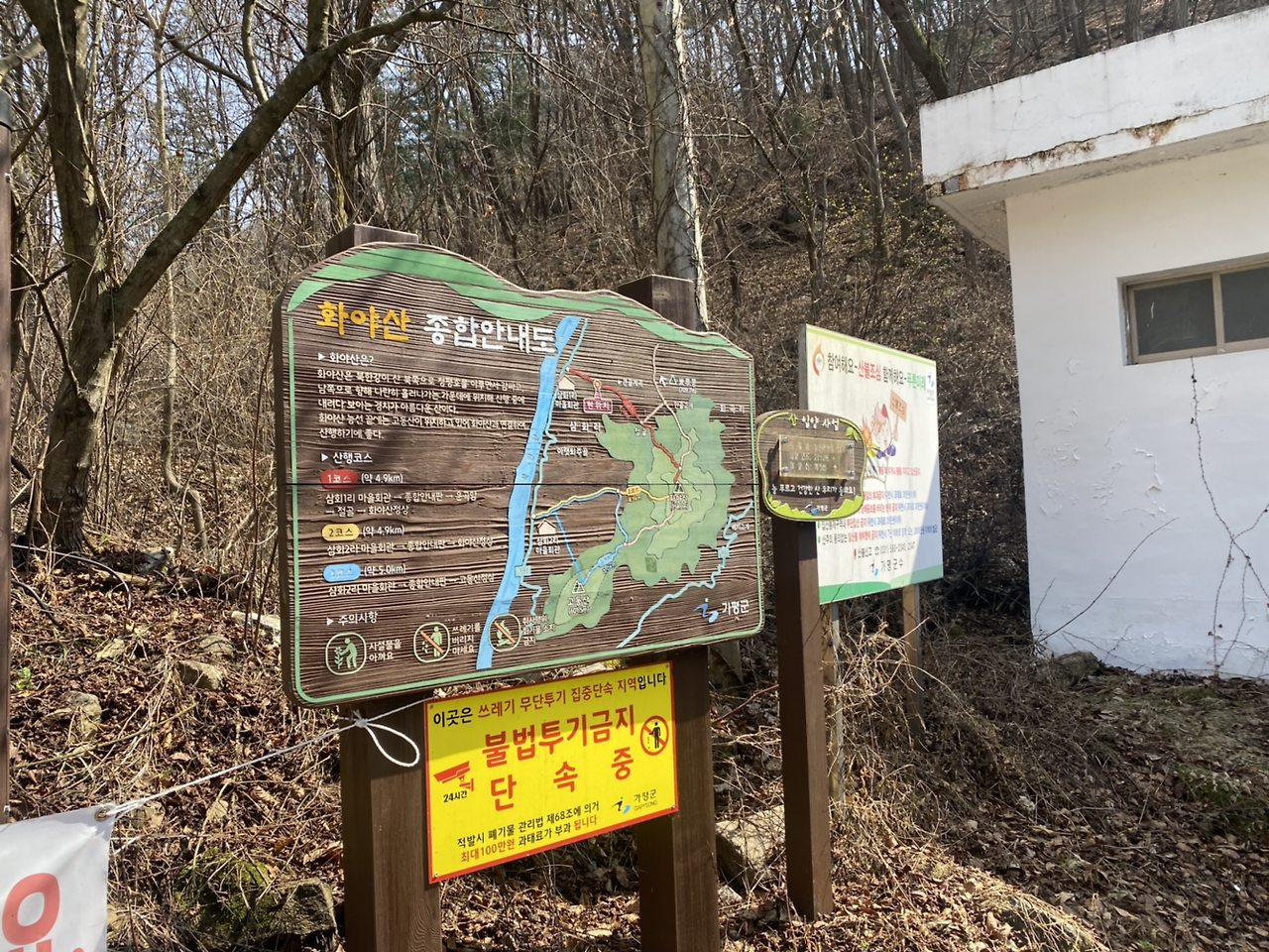 화야산은 정말정말 작은 산이다. 입구도 작다. 주차장도 작고, 화장실은 꿈도 못꾼다. 잠깐 산책 간다고 생각하고 가야 한다. 사실 오르막도 많지 않고 코스가 험하지 않아 정말 산책이라고 봐도 무리는 없다. 꽃을 얼마나 오래 보냐에 달려 있겠지만 30분~1시간이면 충분할 것 같다.