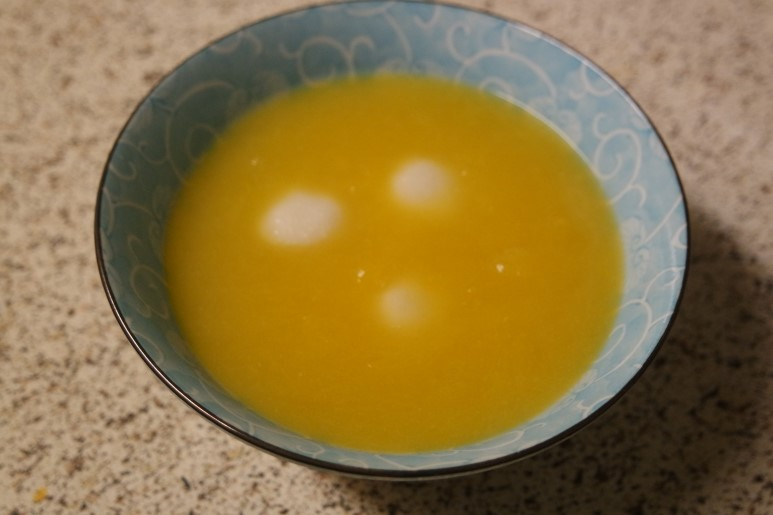 3. 으깬호박이 어느정도 끓으면 찹쌀물을 개어 풀어준 후 빠르게 저어준다. 잘 저어주지 않으면 찹쌀물이 뭉칠 수 있다.
