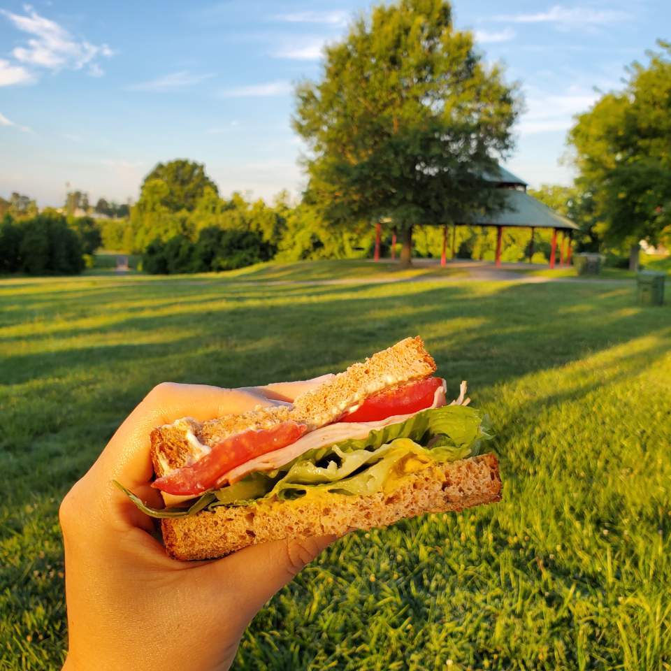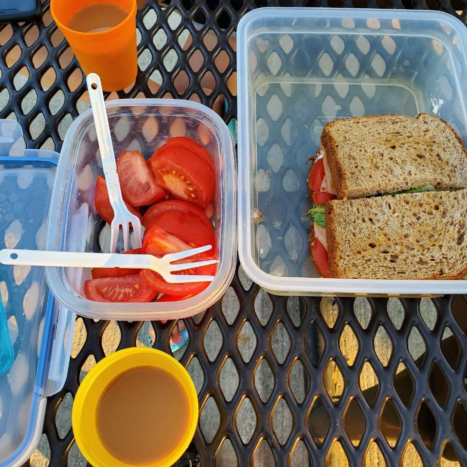 토스트한 통밀빵에 마요네즈를 살짝 발라주고, 신선한 로메인, 토마토, 오이 그리고 샌드위치용 칠면조 슬라이스를 겹겹이 올려 먹기 좋게 반으로 잘라 컨테이너에 담았다. 달달한 아이스 믹스커피가 찰랑거리는 텀블러도 챙겼다.