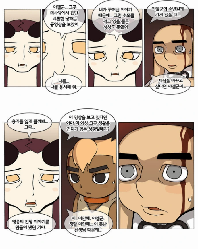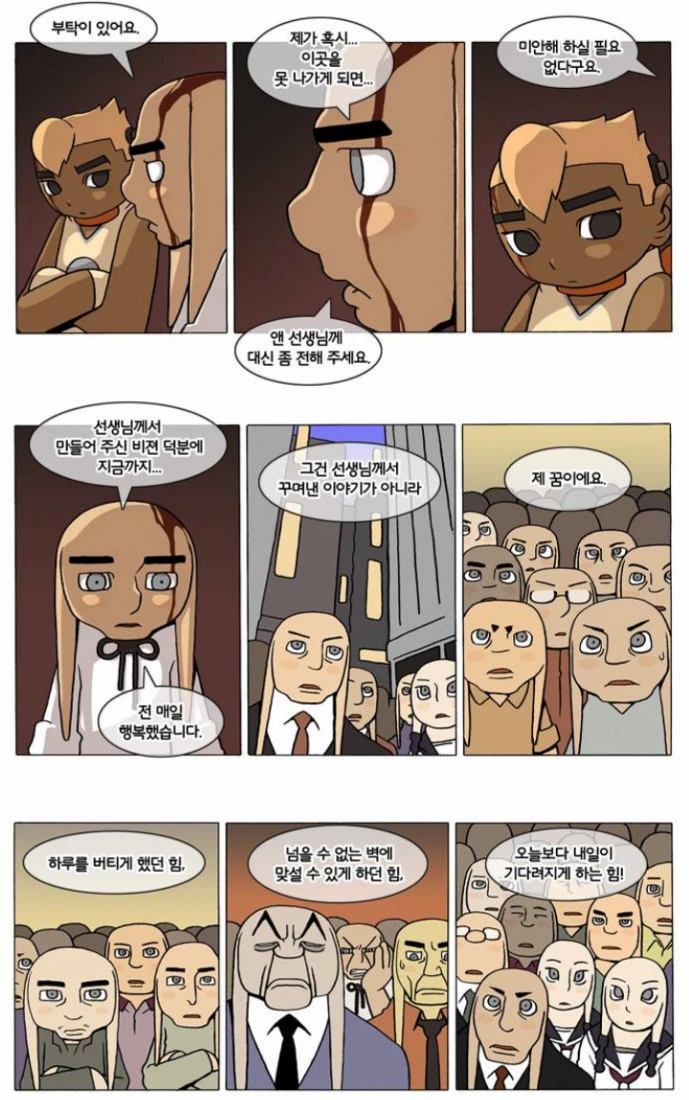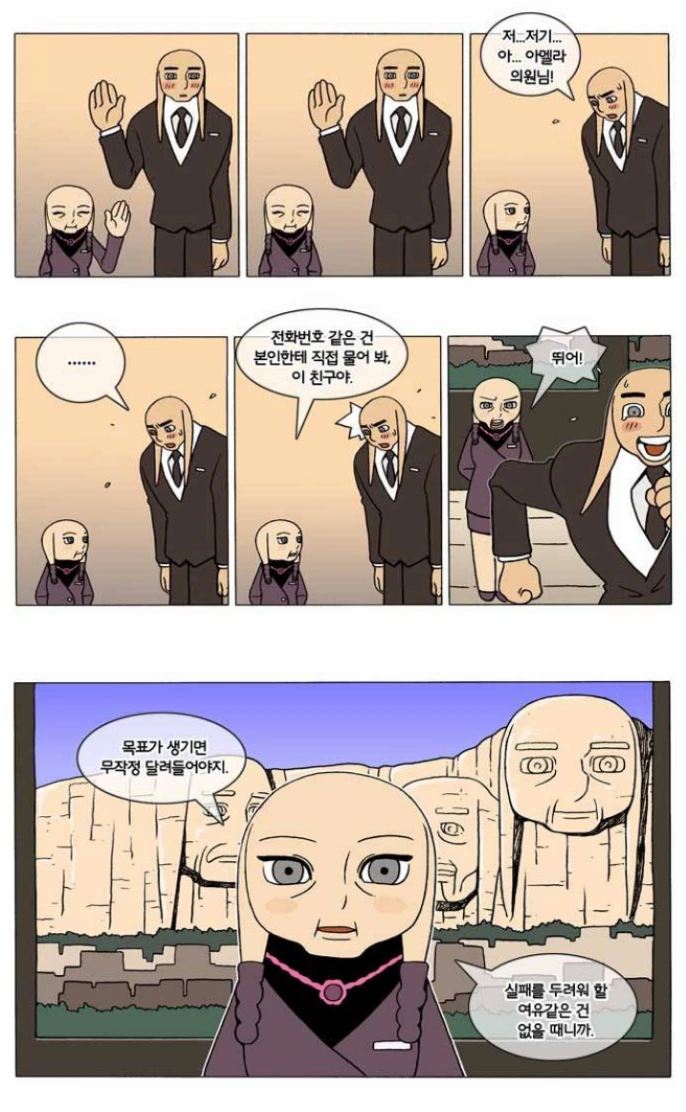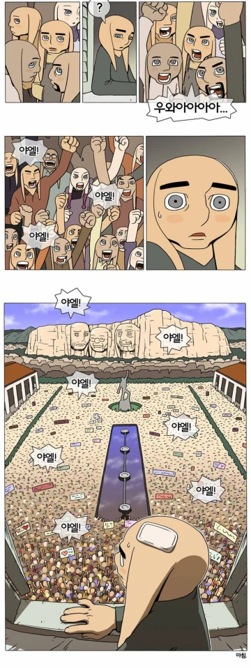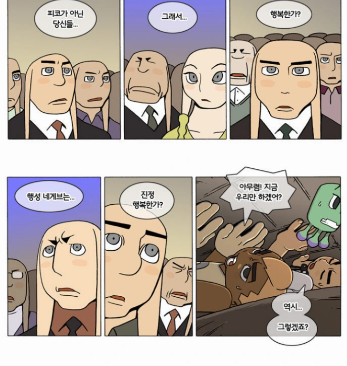 하지만 이 야엘로드의 결말 이후의 50년 뒤를 살짝 보여주는 에필로그에서, 나는 두 가지 약간의 씁쓸함을 느꼈다.50년 뒤의 대화들은 분명 키가 작든 크든 계급이 낮든 높든 평등이 대화하는 듯한 분위기를 풍긴다. 하지만 그 와중에 피코출신 야엘은 왜 굳이 키를 크게 그렸을까? 50년이나 걸려서 국회의 유력 정치인으로 성장하기까지 저 야엘조차도 결국 국회의장이 기계몸을 타고 키를 키웠듯이 상층 출신인 것처럼 가장하는 것은 어쩔수 없는 처사인 것일까? 정치인이 누구나 국회에서 정장을 입어야 하듯이? 그 유시민조차도 국회에 처음 청바지를 입고 출근했다가 동료 의원들에게 제지를 당하고 다음날부터 말끔한 정장을 입었듯이 양영순의 현실 풍자인 걸까?