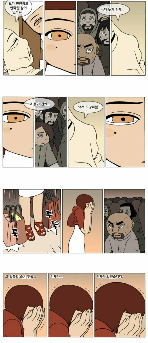 그리고 이제 수녀원으로 돌아온 나오미는 이전의 자신과 마찬가지로 현재에 너무나 힘들어하는 후배를 만나고 원장수녀님이 말한 말씀을 계속 전해준다. 도망치라고. 자신은 이미 잘 다녀왔다고. 심지어 이 후배의 이름은 마리아, 덴마의 세계에 기독교는 없고 그와 닮은 종교들만 있지만 예수를 낳았다는 성모 마리아를 떠올리지 않을 수가 없는 이름이다. 물론 이것은 순전히 내 자의적 해석이지만, 나오미라는 이름 자체도